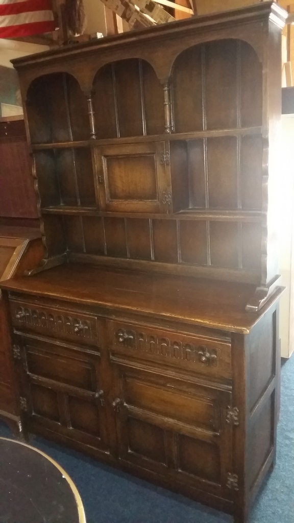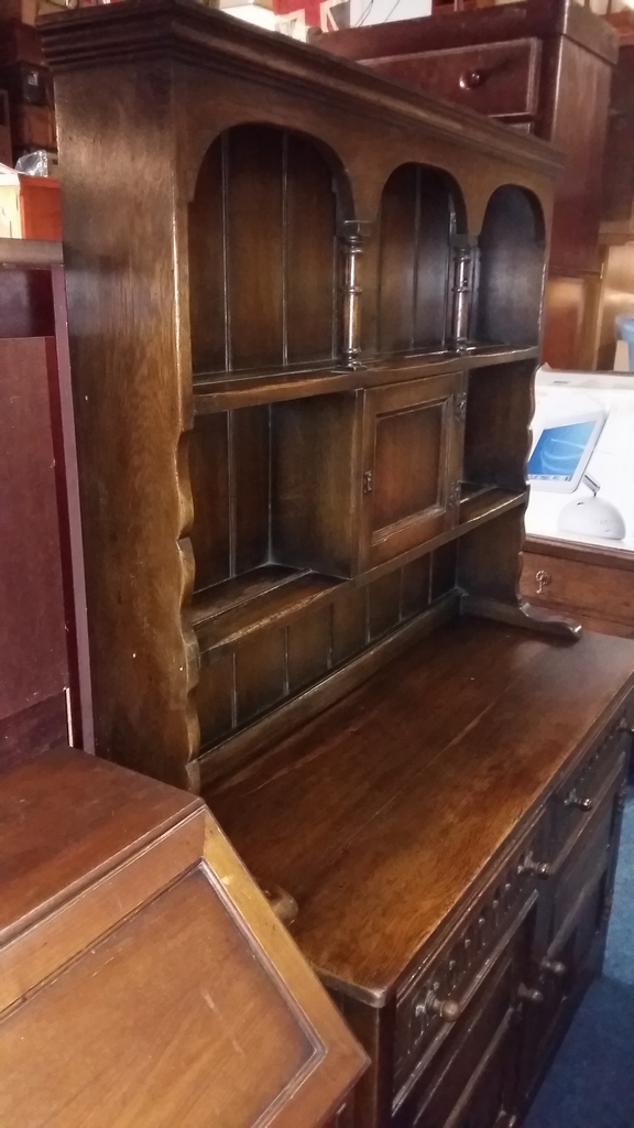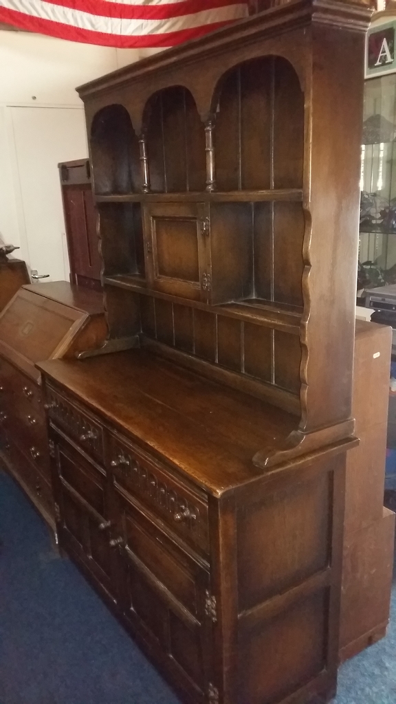 This is a beautiful old dark oak Welsh Dresser. It has a lovely used worn condition/patina.